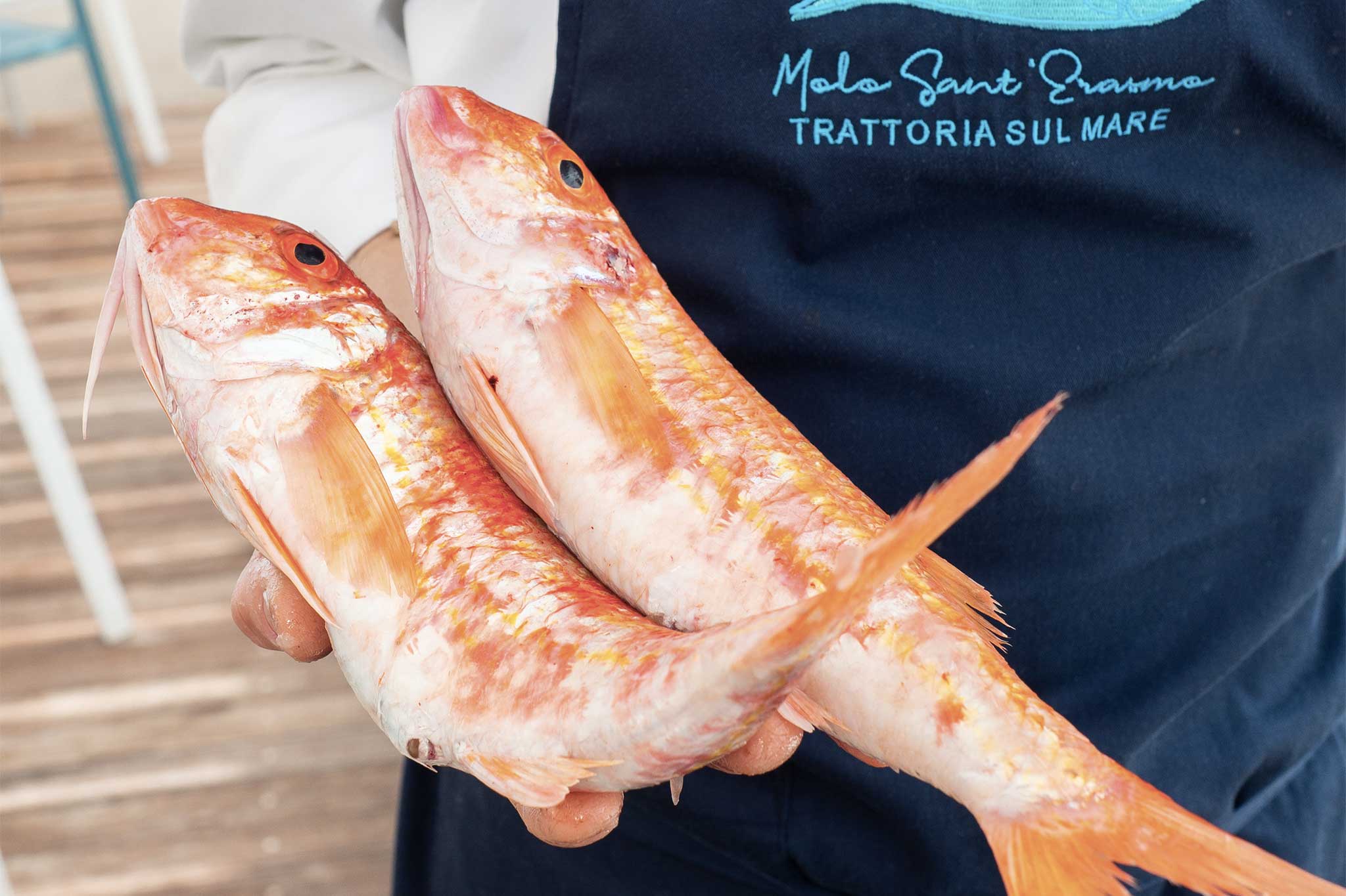 Adagiarvi sul fondo di ogni piatto il pesto di menta sopra disporre un cucchiaio di quello di uvetta e pinoli e su questo adagiarvi una triglia. Rifinire con alcune gocce di salsa all’aglio, un poco di composta di cipolla rossa e ciuffi di menta.