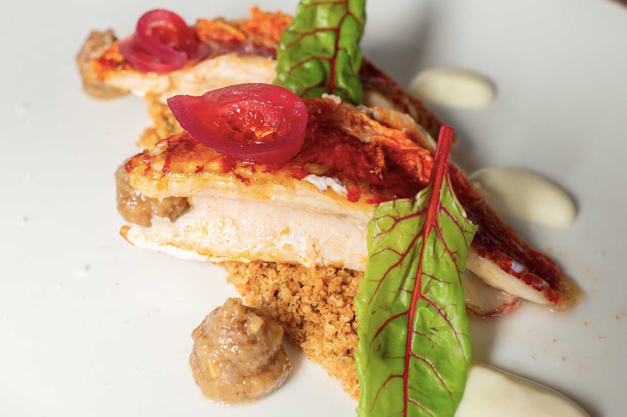 Triglia in crosta di pane al finocchietto, composta di cipolla rossa, salsa all’aglio di Nubia e pesto di uvetta e pinoli